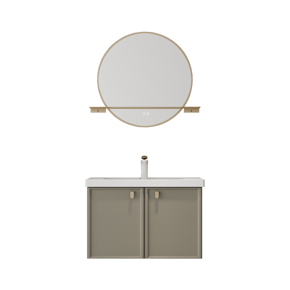 - 新中式设计元素:徽派建筑元素(吸塑造型门板提取马头墙元素,香槟金带纹理造型拉手提取飞檐和琉璃瓦元素),金属包边圆镜搭配触控氛围灯设计,传统与时尚碰撞,呈现新中式格调